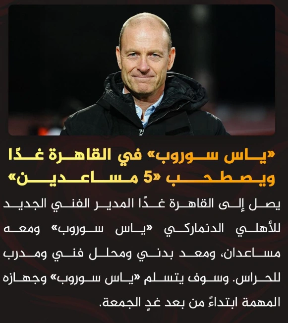 يستعد النادي الأهلي لبدء مرحلة جديدة تحت قيادة المدير الفني الدنماركي ييس توروب، الذي من المقرر أن يصل إلى القاهرة خلال الساعات المقبلة لبدء مهامه رسميًا مع الفريق الأول لكرة القدم بالنادي.
