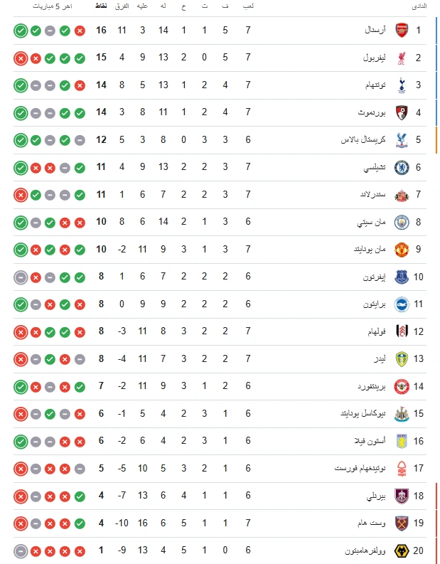بعد انتهاء الجولة السابعة من الدوري الإنجليزي الممتاز، أصبح ترتيب الجدول على النحو التالي: